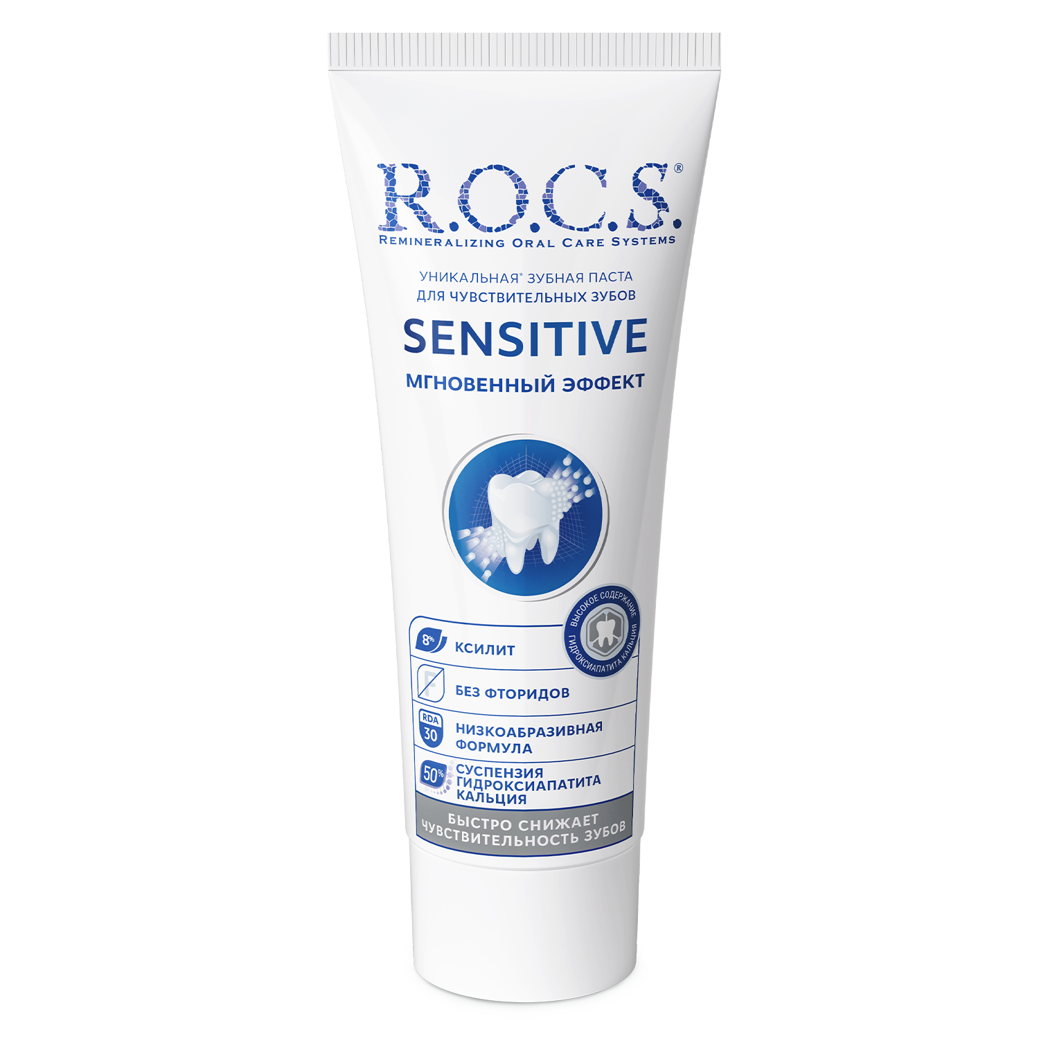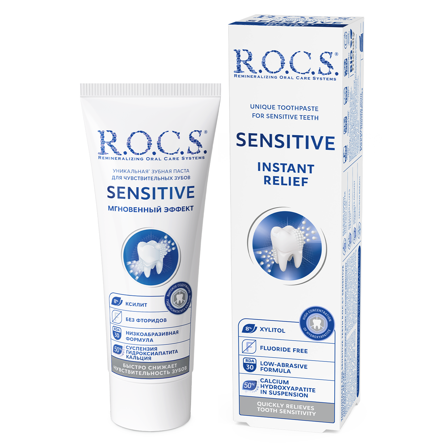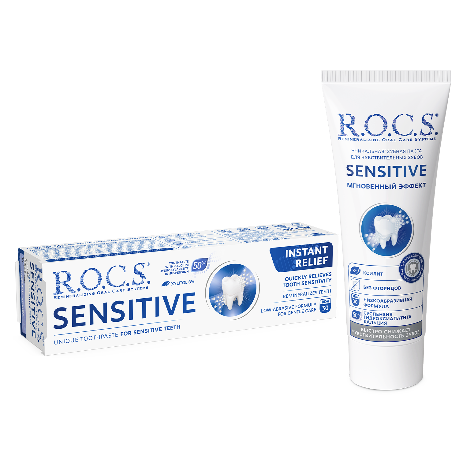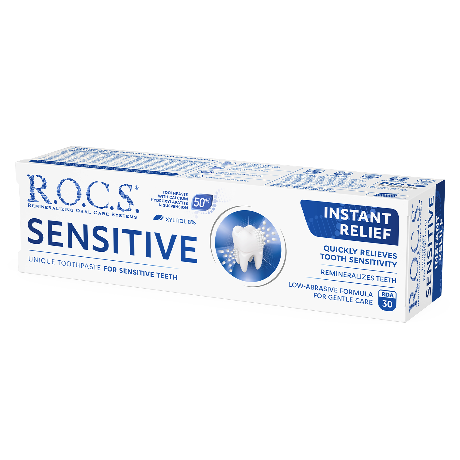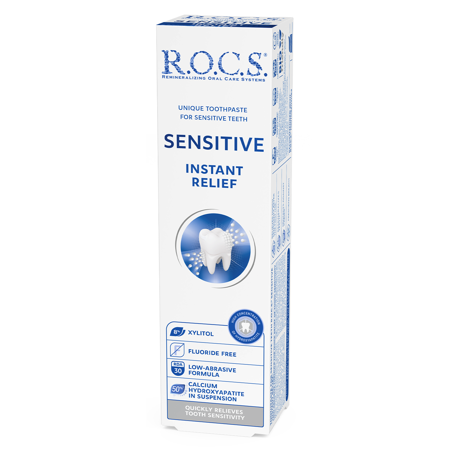ROCS Toothpaste Sensitive Instant Relief provides rapid and effective relief from tooth sensitivity. This specially formulated toothpaste gently cleans teeth while helping to block pain signals, allowing you to enjoy your favorite foods and beverages without discomfort.