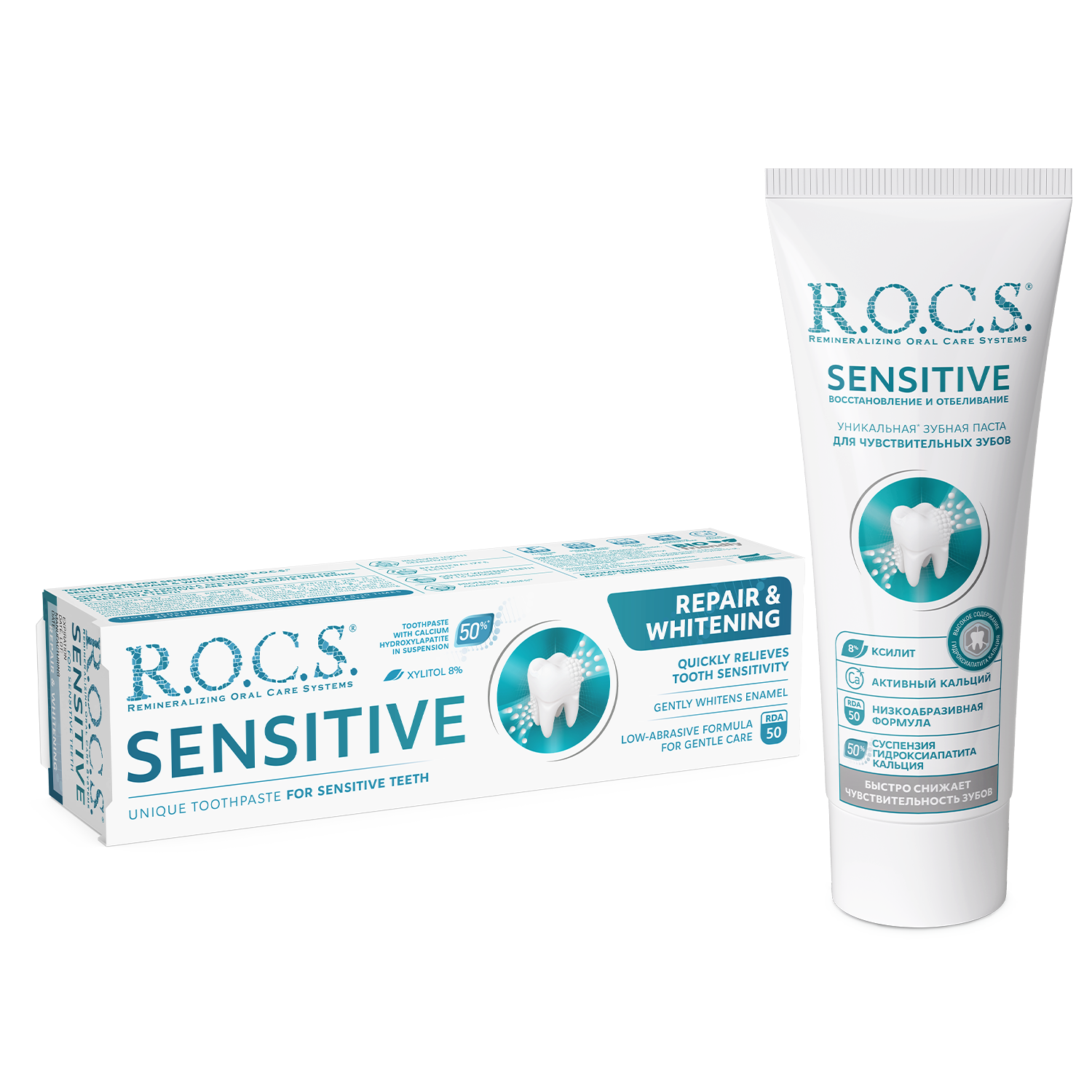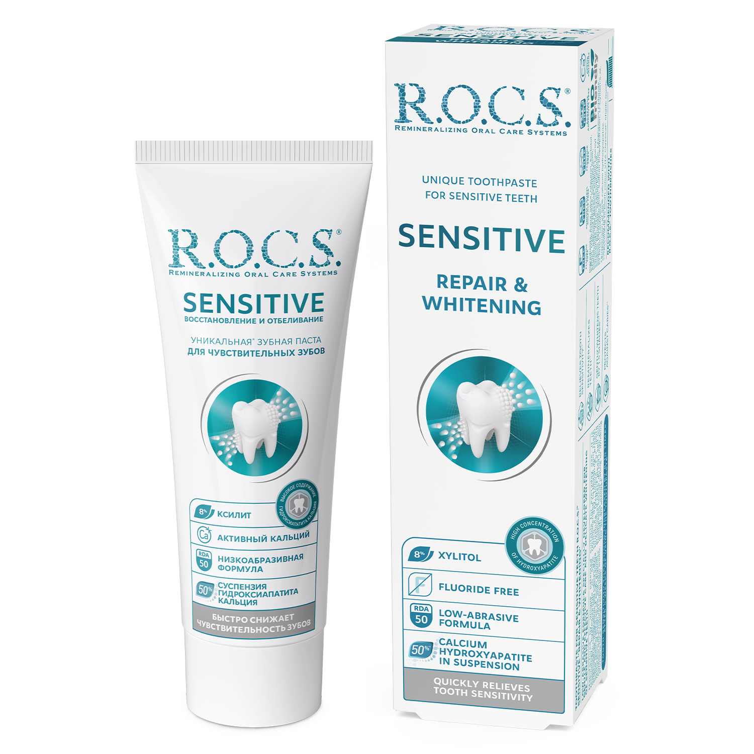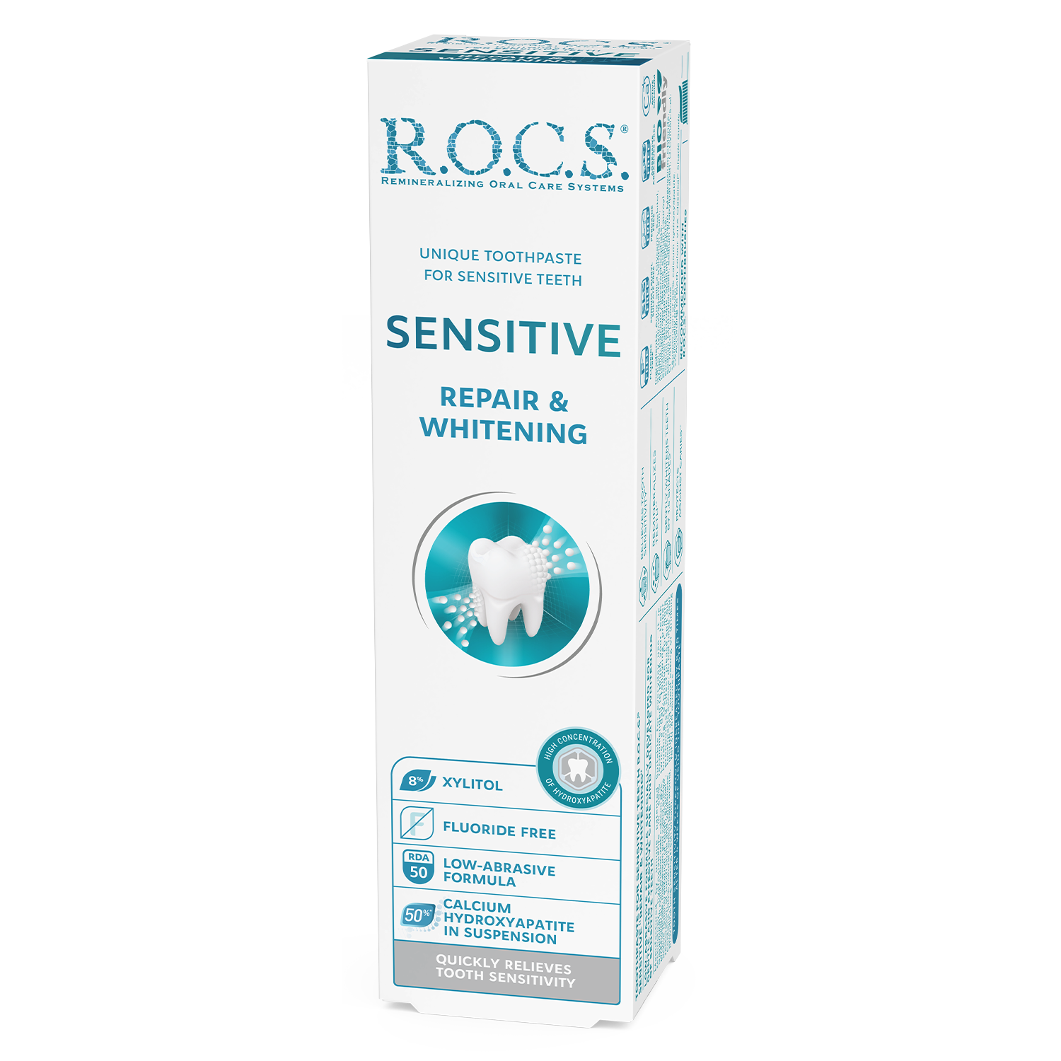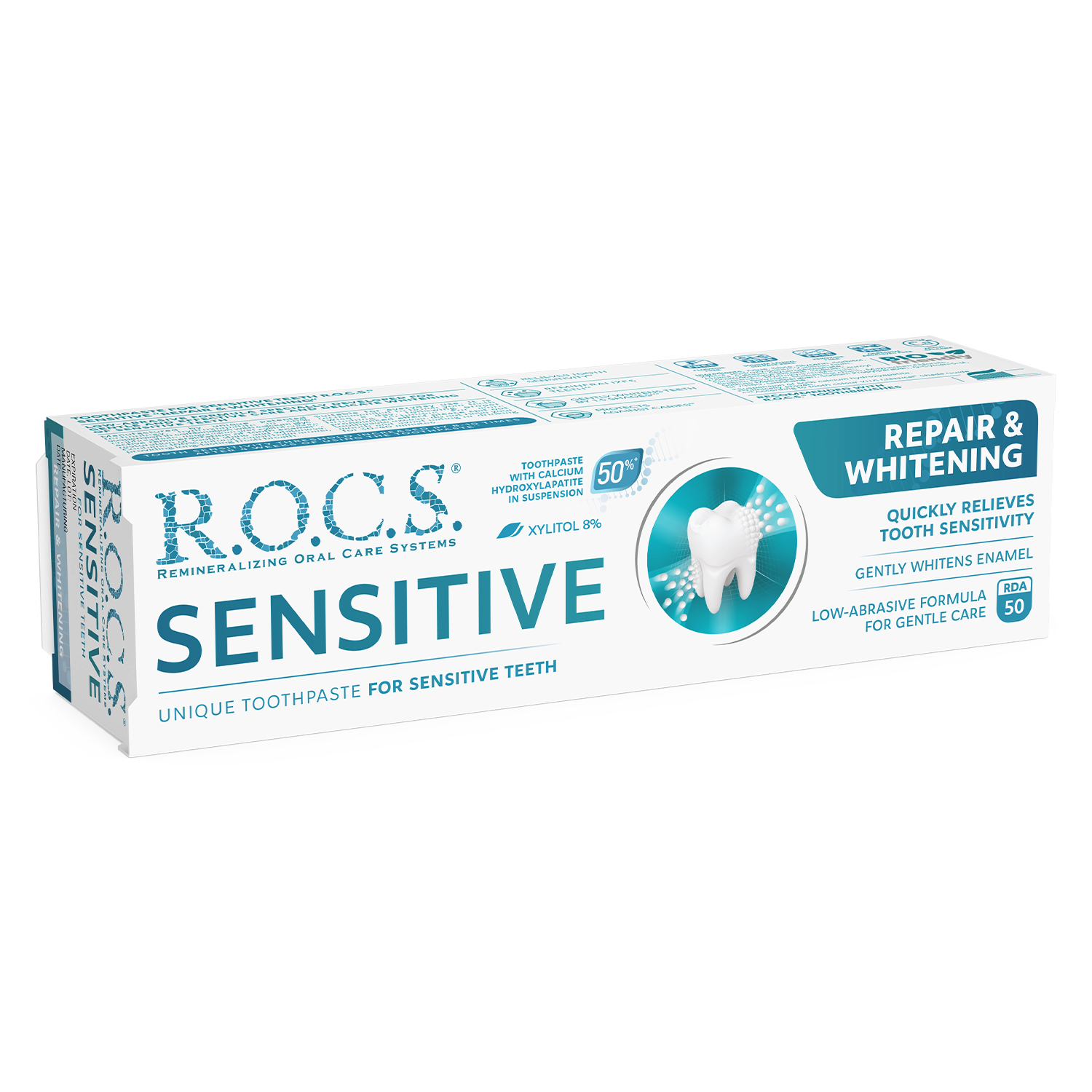 ROCS Toothpaste Sensitive Repair & Whitening is a specially formulated toothpaste designed to provide relief from tooth sensitivity while gently whitening enamel. This toothpaste helps to strengthen and protect teeth, promoting overall oral health and a brighter smile.