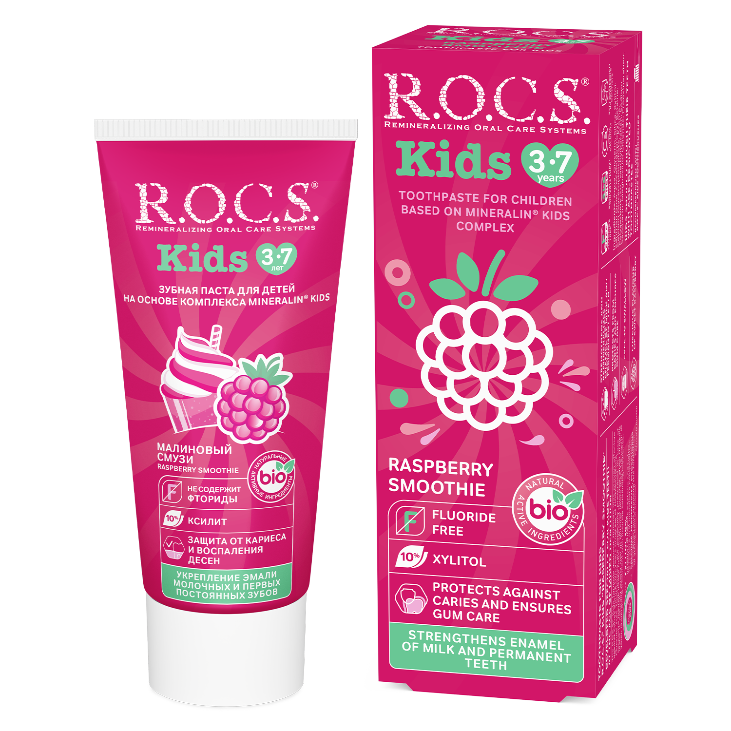 ROCS Kids Raspberry Smoothie Toothpaste is specially formulated for children aged 3-7 years to provide gentle and effective oral hygiene. This toothpaste helps protect young teeth from cavities and strengthens enamel while offering a delicious raspberry smoothie flavor that encourages regular brushing.